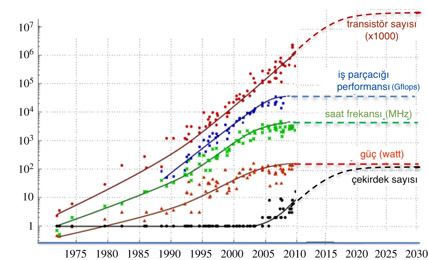 Grafikte transistör sayısı ($10^{7}$), performans ve güç tüketimi eğilimleri görülmektedir.